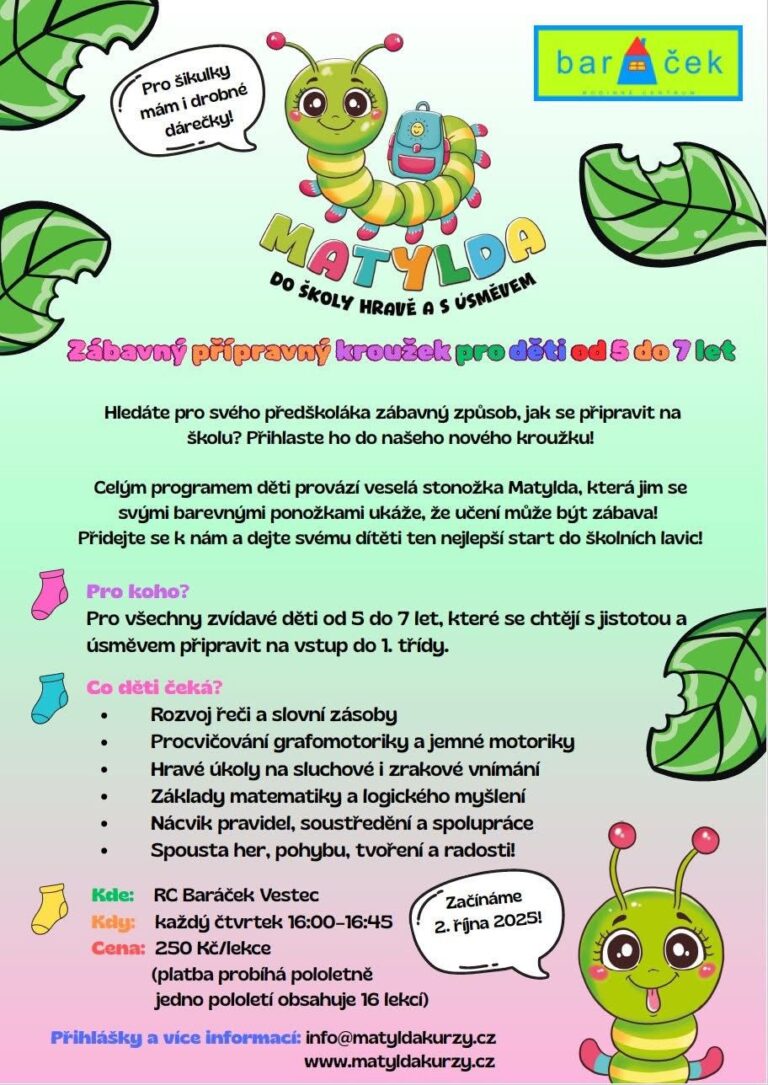 Celým programem děti doprovází veselá stonožka Matylda, která jim se svými barevnými ponožkami ukáže, že učení může být zábava. J Přidejte se k nám a dejte svému dítěti ten nejlepší start do školních lavic.