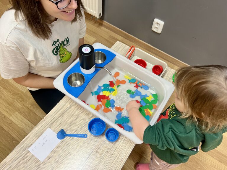 Čeká nás celá hodina her s různými obarvenými materiály, vodou, modelínou a dalšími pomůckami.