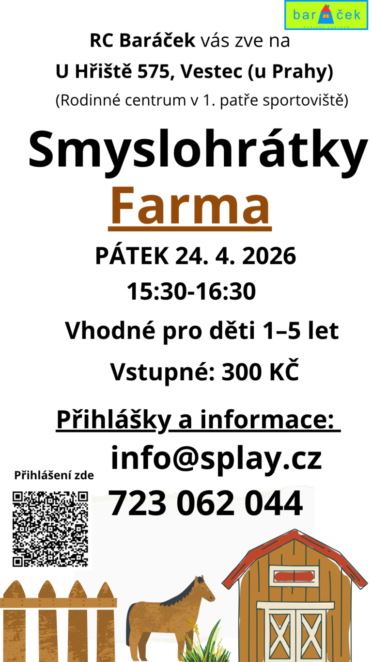 • Kdy: pátek 15:30 – 16:30  pouze 1x měsíčně podle předem vypsaného termínu – 24. 4. 2026 (téma Farma)