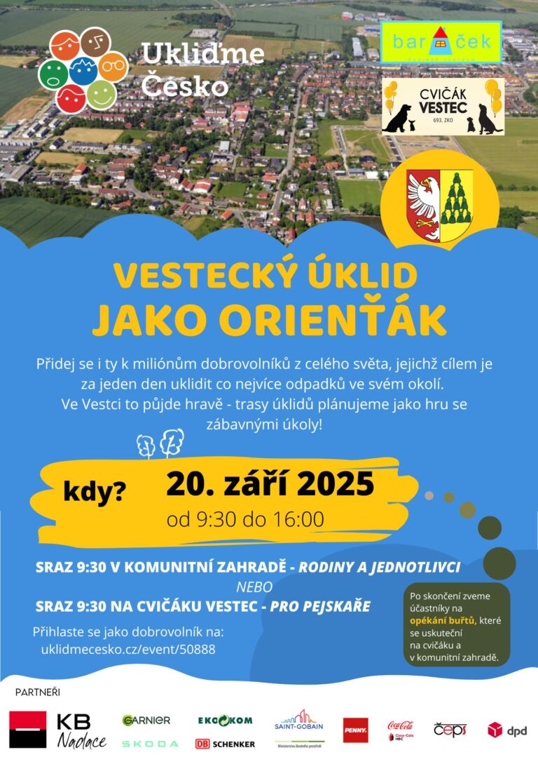 Máte psího parťáka a chcete se také účastnit úklidu? Neváhejte dorazit 20.9. 2025 v 9:30 na psí cvičák ve Vestci, kde Vás i vašeho psího kamaráda čeká spousta zábavy.