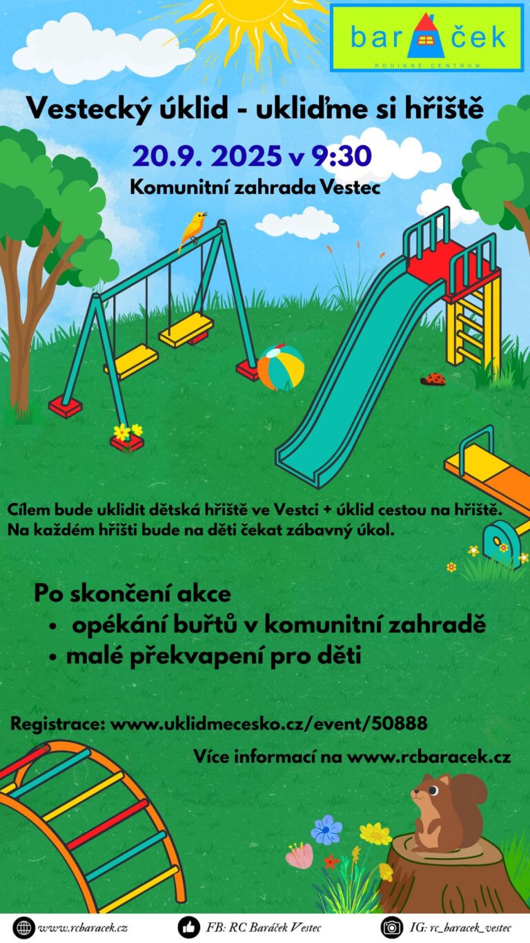 Sraz rodin a jednotlivců bude v komunitní zahradě ve Vestci a cílem bude uklidit dětská hřiště ve Vestci + úklid cestou na hřiště. Na každém hřišti bude na děti čekat zábavný úkol.